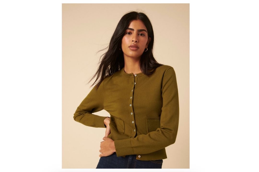 Perfeito para usar em camadas quando o tempo frio chega, este cardigã clássico com gola redonda em um verde outono suave da Nobody's Child exala elegância suave e atemporal. Vista-o com uma camisola, uma saia de seda e botas longas para a noite, ou use com uma camiseta branca justa, jeans largos e um par de tênis. Um cardigã é um item básico perene do guarda-roupa, e este também está disponível em rosa; então certifique-se de comprar este enquanto está com 25% de desconto antes que se esgote como o cardigã de caxemira de Ninguém's Child.