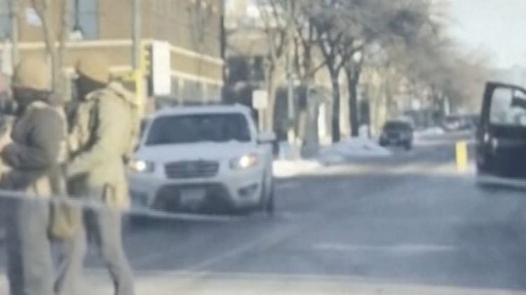 Um tiro é ouvido, mas com os policiais cercando o homem, não está claro de onde veio. Vários agentes recuam. Mais tiros são ouvidos. Os policiais recuam e o homem fica imóvel na rua.