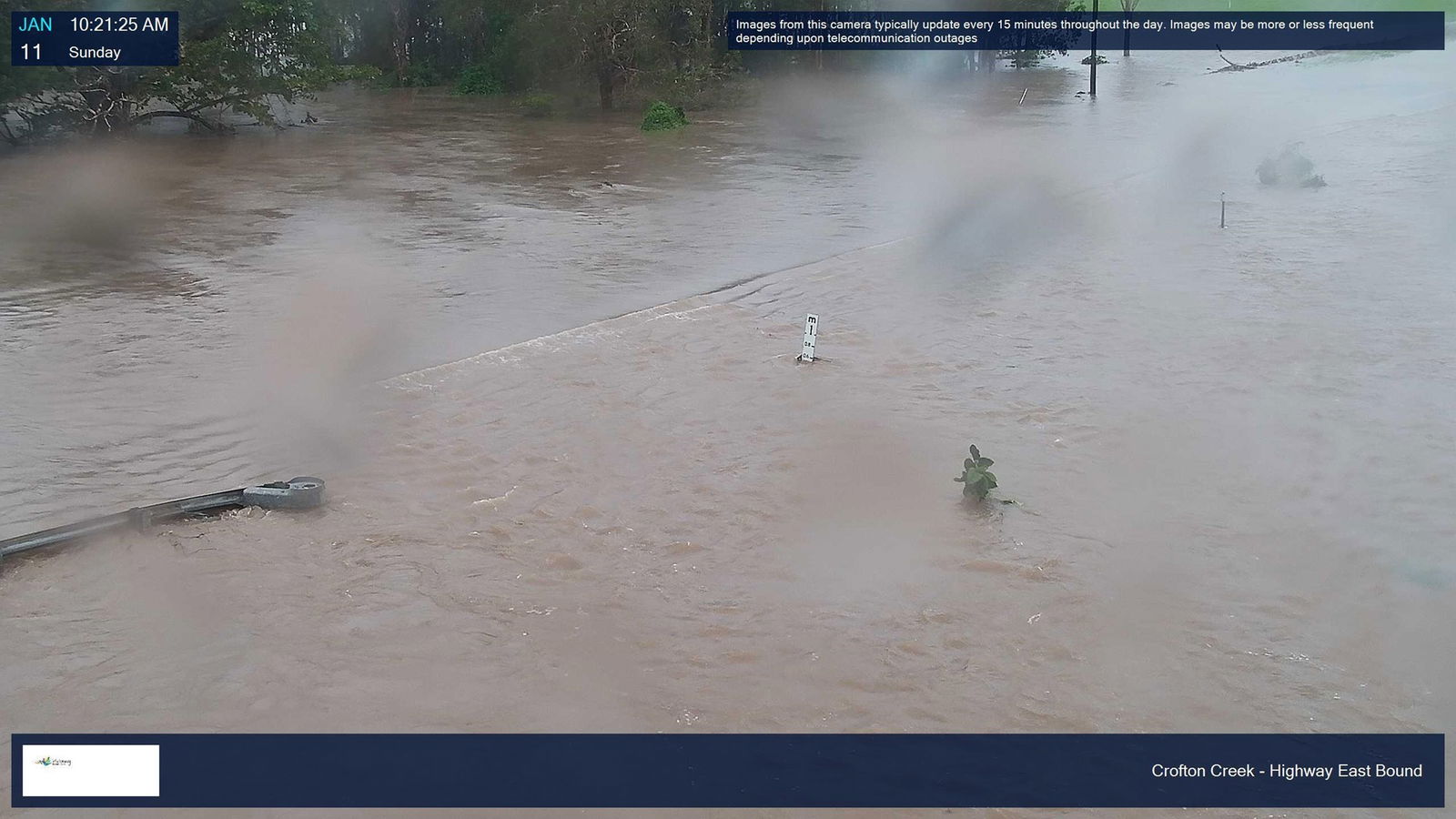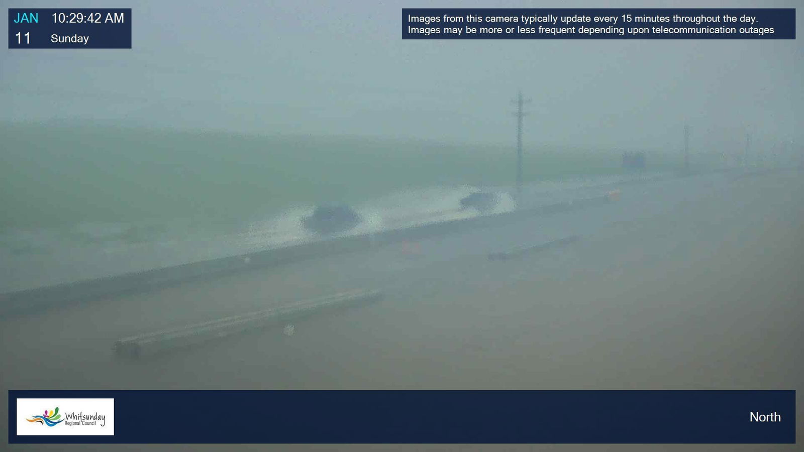 Imagens de câmeras de inundação na região de Whitsundays mostraram a extensão das chuvas na manhã de domingo.