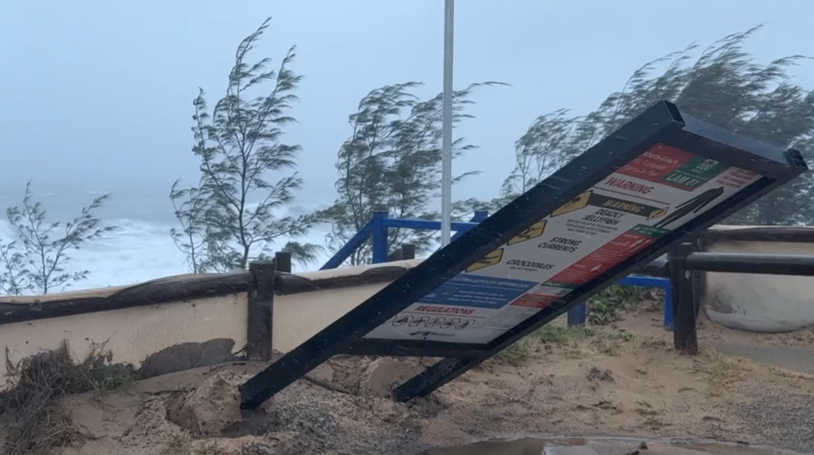 nosso repórter Liam O'Connell Ele está encalhado em Mackay, onde afirma que o vento causou danos aos sinais de alerta ao longo da costa.