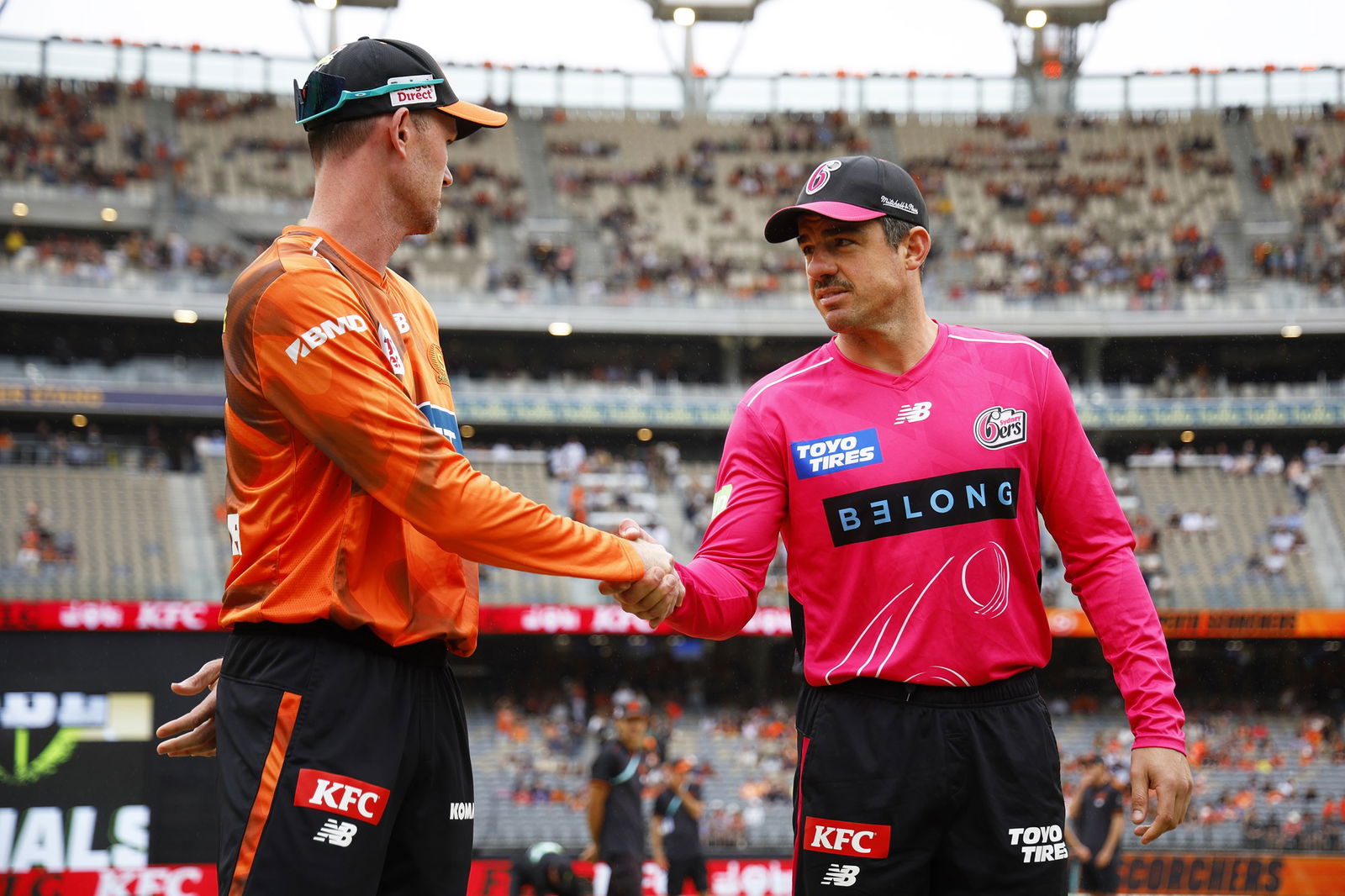 Os Perth Scorchers correram sob aplausos e fogos de artifício, seguidos pelos rebatedores iniciais dos Sixers, Steve Smith e Moisés Henriques.