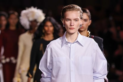 Esses clientes incluíam nomes como Charles Baudelaire, Catherine Deneuve, Winston Churchill, Gary Cooper, Eduardo VII e VIII, Jane Birkin, o Marajá de Patiala, Marcel Proust, Richard Avedon e Sofia Coppola, que usaram camisas Charvet como uniforme durante as filmagens de seus filmes. Ou, claro, Boy Capel. Foi graças a ele que Mathieu Blasi, de mãos dadas com Charvet, criou três camisas para o desfile primavera 2026, e por isso representam o símbolo principal dentro e fora da coleção. Quer sejam gravatas amarradas à túnica de uma bailarina em 1929 ou numa passarela em 2025, Charvet é a prova de que, no meio de uma crise na indústria da moda, o luxo pode ser muito mais do que apenas um termo. Também poderiam ser 200 anos contínuos de qualidade.