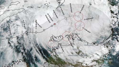 Às 3h30 ACST (5h AEDT, 4h AEST), o ciclone de categoria um tinha ventos sustentados de 75 km/h e rajadas de até 100 km/h.