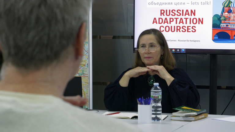Estamos observando uma aula de russo organizada por um clube de expatriados para ajudar seus membros a se integrarem na sociedade local.