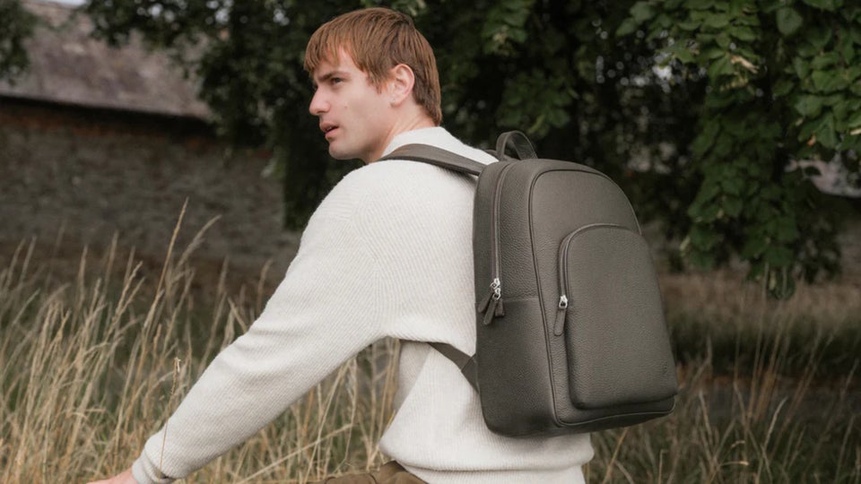 Eu cobiço a mochila Ayrton, uma bolsa de couro Vachetta de flor integral, ideal para viajantes, que oferece um slot para laptop de 16 polegadas e um bagageiro integrado.