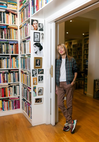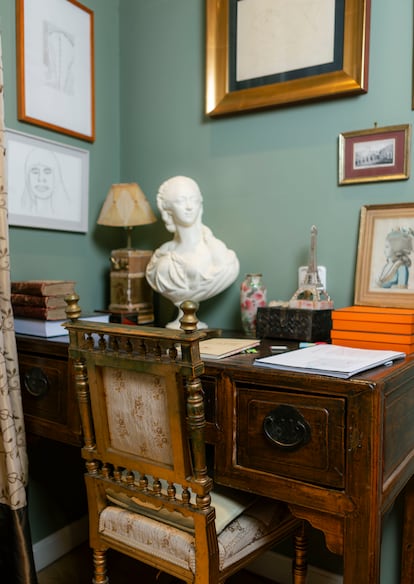 Na sala contígua à sala há um gineceu impressionante: “Teoria feminista, poesia, lesbianismo, teoria jurídica, cartas e diários, autobiografias e biografias, romances, sufragismo, autores modernos, o que os homens dizem sobre as mulheres…”. E uma coluna inteira é dedicada a Virginia Woolf. No centro está um sofá vermelho coral e à esquerda uma pequena mesa de madeira com as cartas de Jane Austen publicadas em inglês, o dicionário de Maria Moliner e blocos de livros. postar issoCom. “Acabei de comprar estes três volumes, são de 1796 e é um romance. Esticadora obra de Frances Burney, uma escritora que Austen amava.” Ao lado dela está uma pequena cadeira de baile suíça do século 18. “Comprei em Lucerna (Suíça) enquanto viajava por Dover. Naquela época estávamos viajando em um ônibus com espreguiçadeiras. Pela manhã chegamos nas cidades, tomamos café da manhã no quarto e fizemos passagem de som. Lucerna é muito pequena, tinha uma loja de antiguidades ao lado do quarto, eu vi lá, comprei e colocamos no ônibus da melhor maneira que pudemos.”