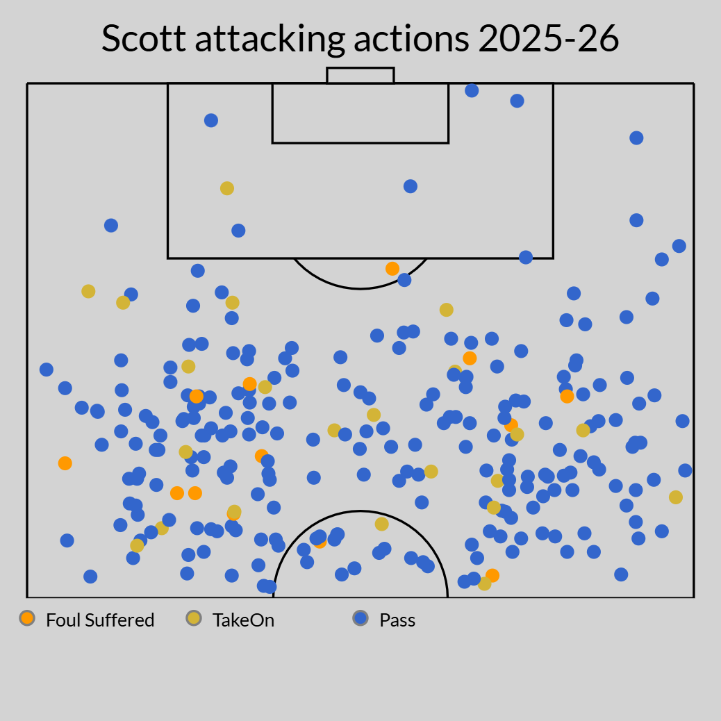 Scott é mais um meio-campista do tipo 'recebe e conecta' do que um puro manipulador de bola; seu carregamento progressivo (1,95 por 90) e estatísticas de ataque bem-sucedido (0,92 por 90) sugerem que ele gosta de jogar para frente, independentemente do cenário. Mas embora suas habilidades com a bola sejam as primeiras a chamar a atenção, há também um pouco de tenacidade no jogo de Scott. Ele está um pouco atrás dos demais nomes acima em termos de duelos defensivos bem-sucedidos (55%), embora seu trabalho defensivo certamente esteja indo na direção certa e não haja dúvidas sobre sua atitude, pois está disposto a assumir responsabilidades, pressionar e querer a bola para a próxima ação.