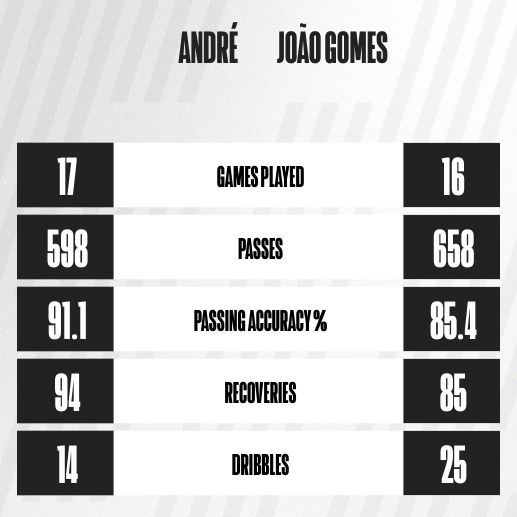 Gomes, por outro lado, fornece energia, alcance e entra em duelos em um ritmo mais elevado (9,7 vs. 6,7 por 90 minutos) e mais alto no campo. Ele persegue as segundas bolas, fecha o espaço de forma agressiva e transforma posses repetidas em impulso para frente. Comparado a André, Gomes se sente mais confortável em jogos alongados, pois suas habilidades são mais de porte e aceleração brusca. A desvantagem é que ele é menos definidor de ritmo e não ditará o ritmo de forma consistente desde o fundo.