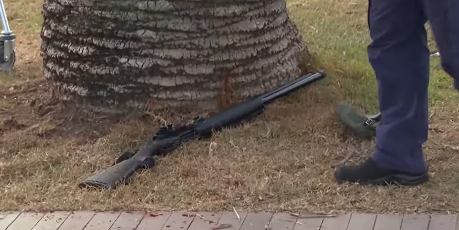 Imagens da cena mostram o que parece ser uma espingarda caída no chão ao lado de um boné de beisebol, com um policial parado por perto.