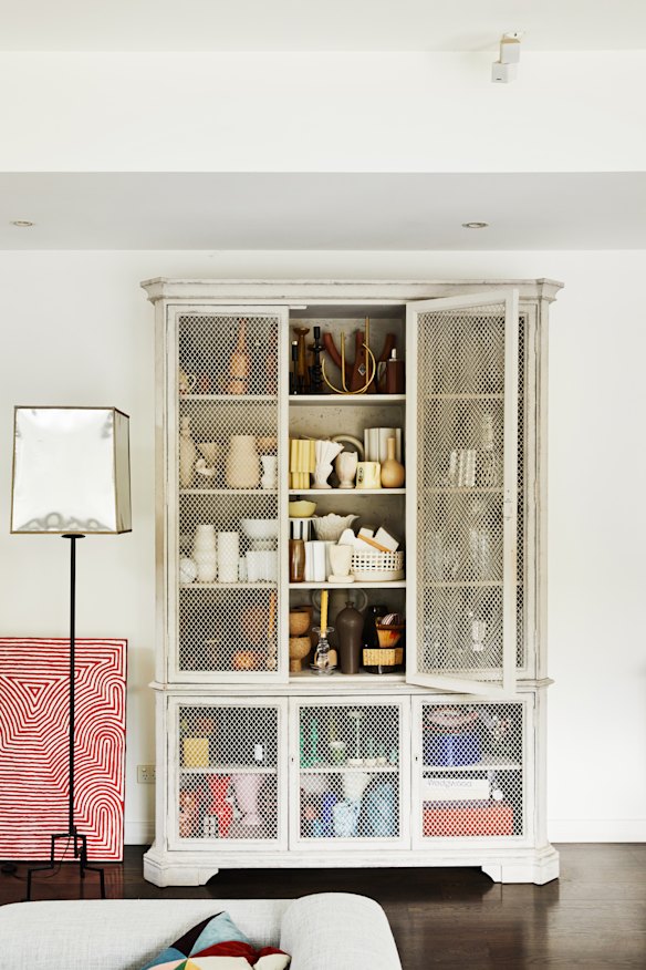 “Esse é o armário mais usado da casa e adoro como a malha permite ver os tesouros que tem dentro”, diz Lambos. A arte é de Aubrey Tjangala. Crédito: Armelle Habib