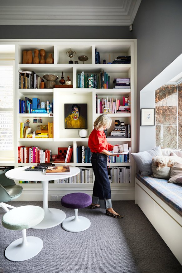 “Este seria o escritório do Peter, mas adaptámo-lo adicionando uma secretária redonda da IKEA para mim”, diz Lambos. A pintura, Elvis in Drag, é de Nick Osmond. Crédito: Armelle Habib